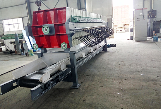 在壓濾機濾板下方裝置了皮帶輸送,用于輸送濾板拉開時卸下的濾餅。該裝置適用于不易做基礎的工作現(xiàn)場,可以把物料輸送到指定的地方,減輕了員工勞動強度,工作環(huán)境得到改善。本發(fā)明還在傳統(tǒng)輸送帶的基礎上做了改進,使壓濾液會因重力作用全部自動流到接水裝置中,出泥端不會有壓濾液流出而使壓干的污泥再次潮濕,壓濾液也不會流到地面上。